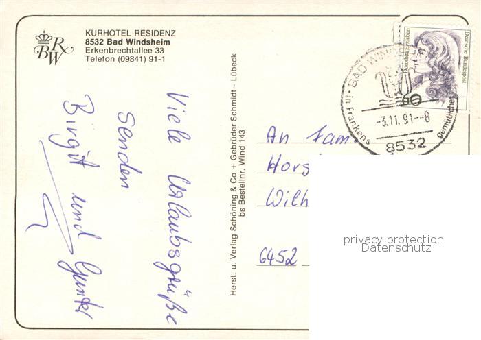 73765950 alte Postkarte Bad Windsheim Kurhotel Residenz Restaurant Konfrenzraum Empfang Hotelzimmer Schwimmhalle postalisch gelaufen Erhaltung siehe scans [FriedD77] KatCode: 11110009575112