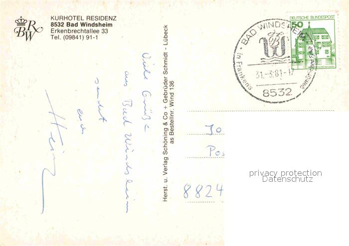 72620572 alte Postkarte Bad Windsheim Kurhotel Senioren Residenz postalisch gelaufen Erhaltung siehe scans [LiesaD40] KatCode: 11110009575112