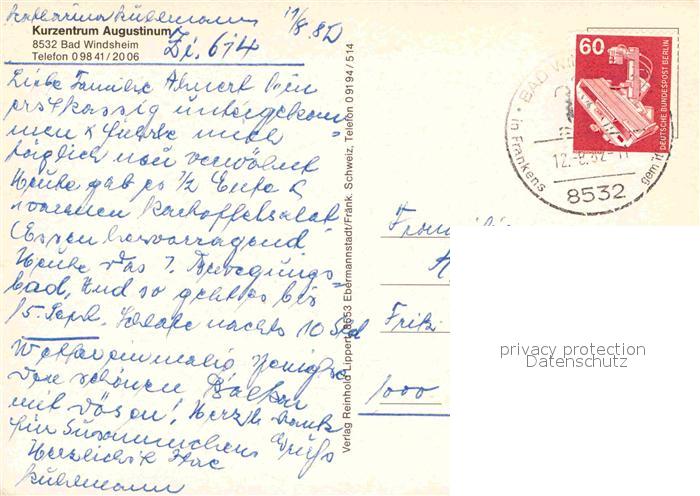 72843891 alte Postkarte Bad Windsheim Kurzentrum Augustinum postalisch gelaufen Erhaltung siehe scans [NatalD47] KatCode: 11110009575112