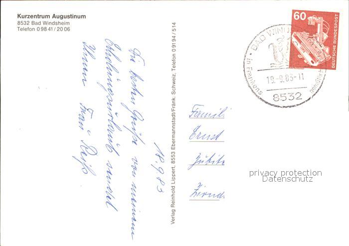71847806 alte Postkarte Bad Windsheim Kurzentrum Augustinum postalisch gelaufen Erhaltung siehe scans KatCode: 11110009575112