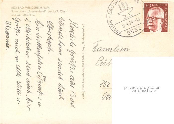 73721248 alte Postkarte Bad Windsheim Sanatorium Frankenland der LVA Ober und Mittelfranken Park Eingang postalisch gelaufen Erhaltung siehe scans [WerneD78] KatCode: 11110009575112