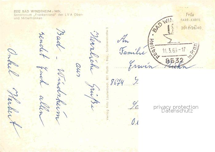 72785209 alte Postkarte Bad Windsheim Sanatorium Frankenland der LVA Ober und Mittelfranken postalisch gelaufen Erhaltung siehe scans [FriedD77] KatCode: 11110009575112