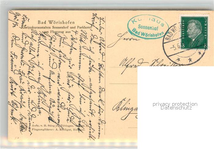 43057914 alte Postkarte Bad Woerishofen Fliegeraufnahme Kneippkuranstalten Sonnehof Parkhotel postalisch gelaufen Erhaltung siehe scans [KathaD81] KatCode: 11110009778116