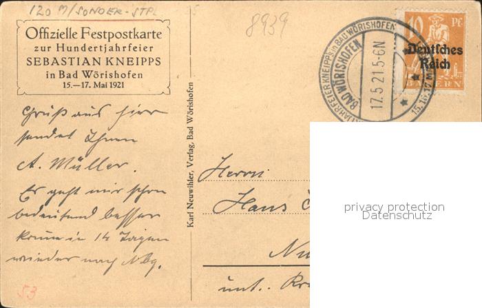 31850000 alte Postkarte Bad Woerishofen Hunderjahrfeier Sebastian Kneipp Portrait Offizielle Festpostkarte postalisch gelaufen Erhaltung siehe scans KatCode: 11110009778116