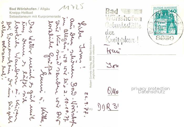 72855075 alte Postkarte Bad Woerishofen Kneipp Heilbad Sebastineum Kurpromenade postalisch gelaufen Erhaltung siehe scans [AndreD76] KatCode: 11110009778116