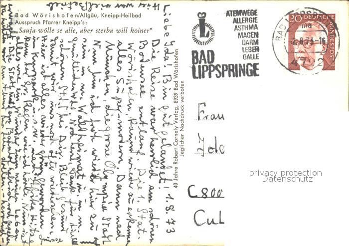 72286159 alte Postkarte Bad Woerishofen Kneipp- Heilbad postalisch gelaufen Erhaltung siehe scans KatCode: 11110009778116