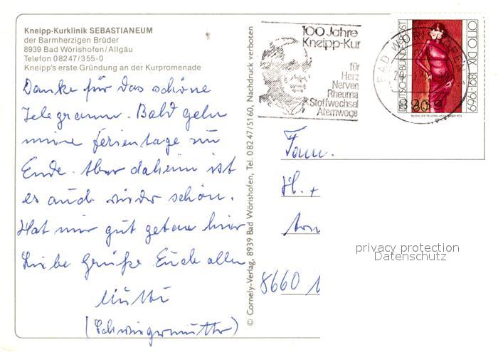 73169494 alte Postkarte Bad Woerishofen Kneipp Kurklinik Sebastianeum postalisch gelaufen Erhaltung siehe scans [FriedD77] KatCode: 11110009778116