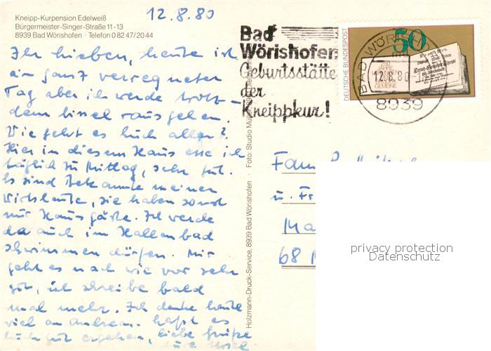 73844986 alte Postkarte Bad Woerishofen Kneipp Kurpension Edelweiss Gaststube postalisch gelaufen Erhaltung siehe scans [WerneD78] KatCode: 11110009778116