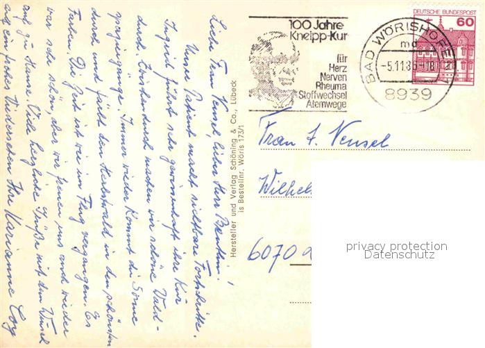 72710366 alte Postkarte Bad Woerishofen Kneippstrasse Kneippdenkmal Kurkonzert postalisch gelaufen Erhaltung siehe scans [LiesaD40] KatCode: 11110009778116
