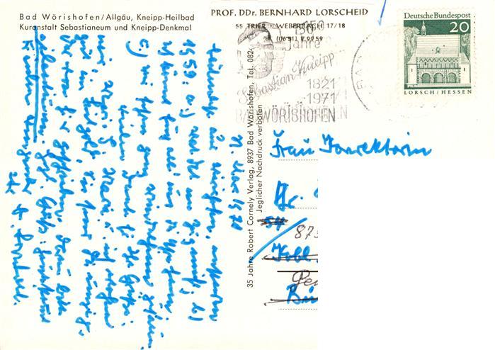 73885295 alte Postkarte Bad Woerishofen Kuranstalt Sebastianeum und Kneipp Denkmal postalisch gelaufen Erhaltung siehe scans [WerneD78] KatCode: 11110009778116