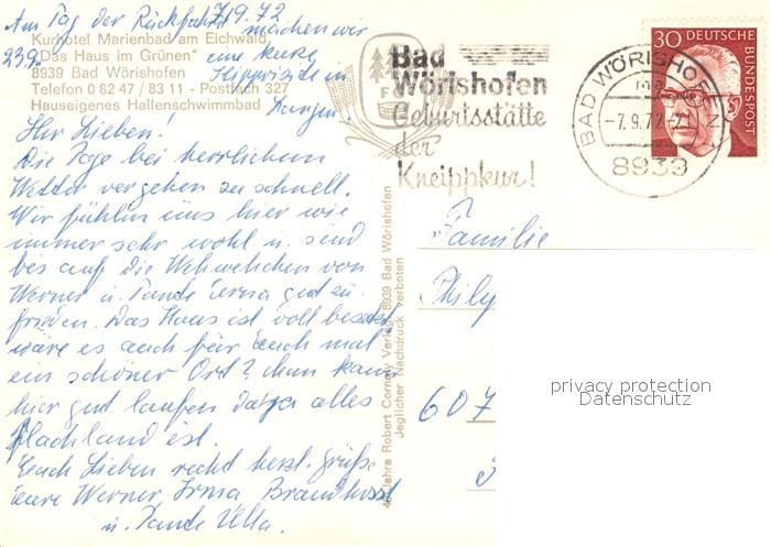 73174808 alte Postkarte Bad Woerishofen Kurhotel Marienbad am Eichwald postalisch gelaufen Erhaltung siehe scans [NatalD47] KatCode: 11110009778116