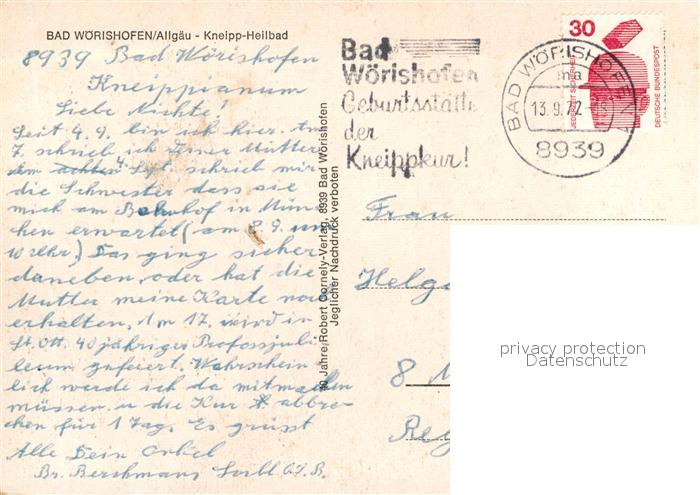 72944952 alte Postkarte Bad Woerishofen Kurpark Wassertreten Birkenallee Portrait Pfarrer Kneipp Waldsee Fontaene Heilbad postalisch gelaufen Erhaltung siehe scans [FriedD77] KatCode: 11110009778116