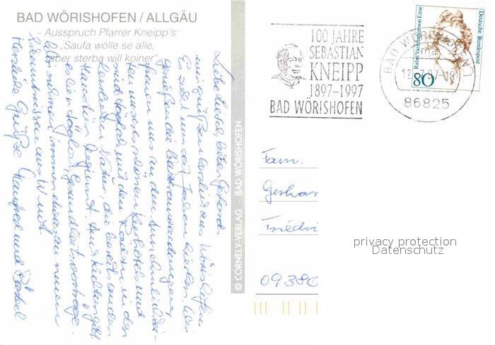 72639705 alte Postkarte Bad Woerishofen Pfarrer Kneipp Portrait Wassertreten Strassencafes Kurort postalisch gelaufen Erhaltung siehe scans [FriedD77] KatCode: 11110009778116
