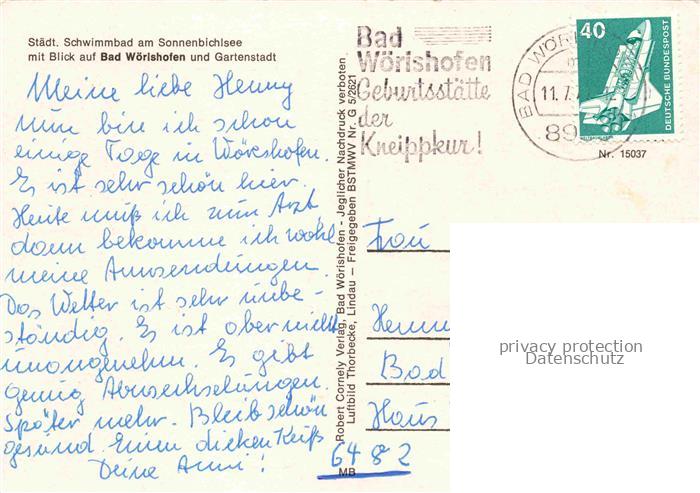 74039513 alte Postkarte BAD WoeRISHOFEN Schwimmbad am Sonnenbichlsee mit auf die Gartenstadt postalisch gelaufen Fliegeraufnahme Erhaltung siehe scans [FriedD77] KatCode: 11110009778116