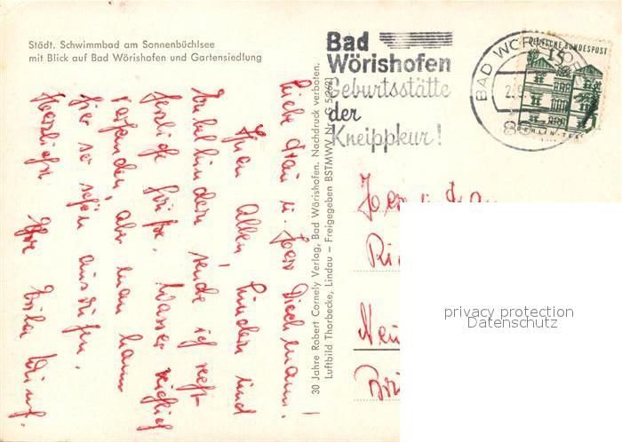 73080481 alte Postkarte Bad Woerishofen Schwimmbad am Sonnenbuechlsee Gartensiedlung Fliegeraufnahme postalisch gelaufen Erhaltung siehe scans [FriedD77] KatCode: 11110009778116