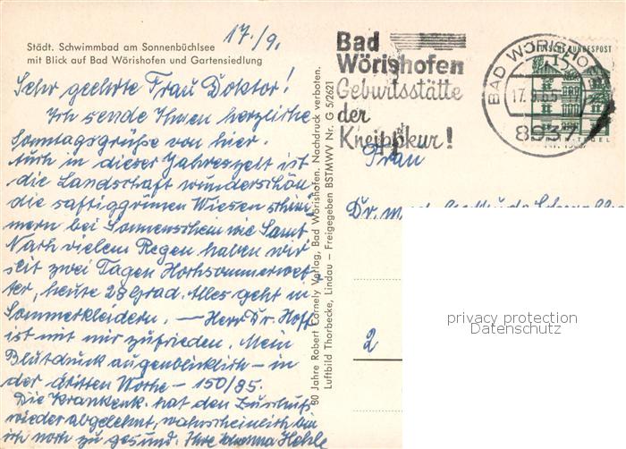 73776692 alte Postkarte Bad Woerishofen Staedt Schwimmbad Ortsansicht Gartensiedlung Fliegeraufnahme postalisch gelaufen Erhaltung siehe scans [WerneD78] KatCode: 11110009778116