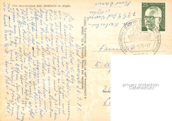 73685368 alte Postkarte Bad Wurzach Fliegeraufnahme mit Wetterstein Nebelhrn Hochgrat Hoher Ifen postalisch gelaufen Erhaltung siehe scans [WerneD78] KatCode: 11110008436010