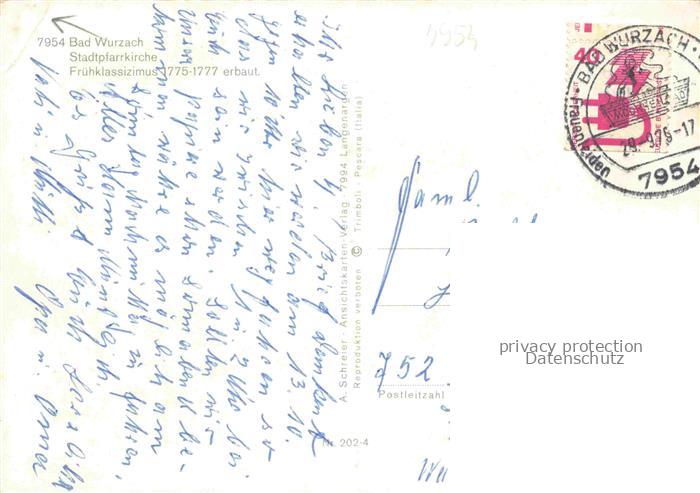 74041159 alte Postkarte Bad Wurzach Ravensburg BW Ortszentrum Stadtpfarrkirche postalisch gelaufen Erhaltung siehe scans [FriedD77] KatCode: 11110008436010