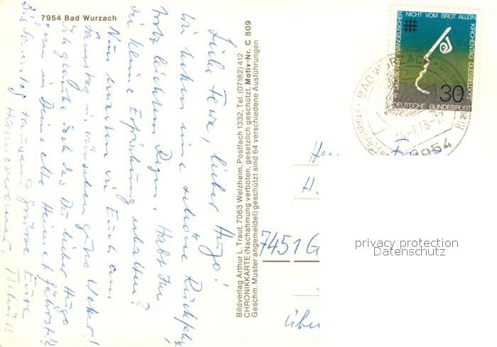 73169474 alte Postkarte Bad Wurzach Schloss Kurzentrum Kurpark Moorfreibad Gottesbergkirche Chronik postalisch gelaufen Erhaltung siehe scans [FriedD77] KatCode: 11110008436010