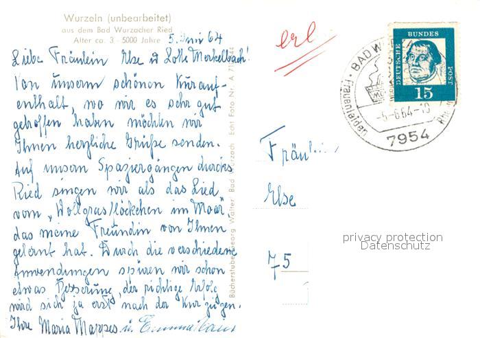 73644503 alte Postkarte Bad Wurzach Wurzeln aus dem Wurzacher Ried postalisch gelaufen Erhaltung siehe scans [FriedD77] KatCode: 11110008436010
