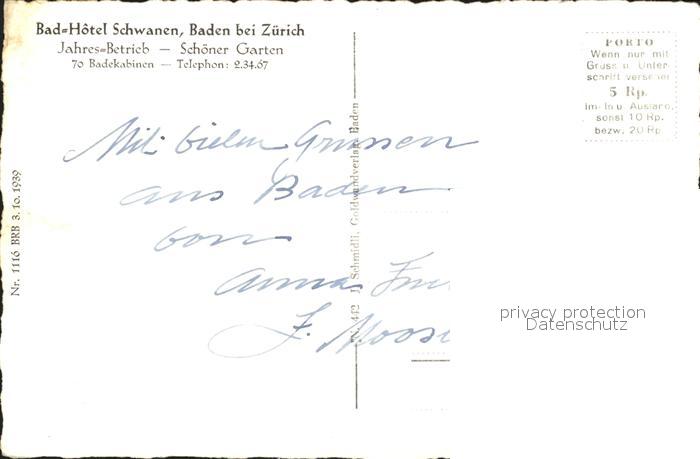 11745655 Baden AG Badhotel Schwanen postalisch nicht gelaufen Erhaltung siehe scans KatCode: 11470010010034