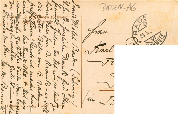 13898780 alte Postkarte Baden AG Station thermale Kuenstlerkarte postalisch gelaufen Erhaltung siehe scans [WerneD78] KatCode: 11470010010034