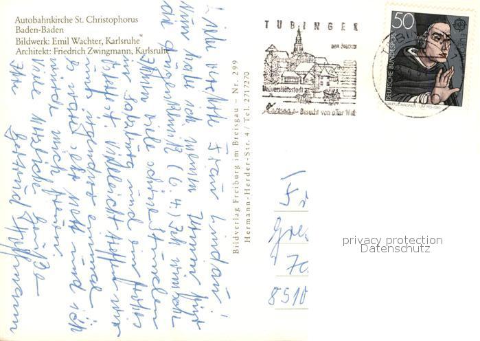 73040852 alte Postkarte Baden-Baden Autobahnkirche St Christophorus postalisch gelaufen Erhaltung siehe scans [FriedD77] KatCode: 11110008211000