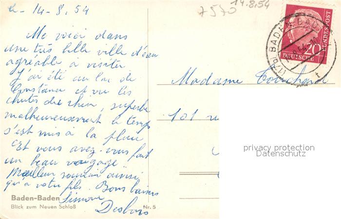 73143049 alte Postkarte Baden-Baden Blick zum Neuen Schloss postalisch gelaufen Erhaltung siehe scans [FriedD77] KatCode: 11110008211000