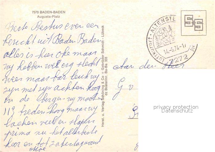 72784058 alte Postkarte BADEN-BADEN BW Augustaplatz Kirche postalisch gelaufen Erhaltung siehe scans [WerneD78] KatCode: 11110008211000