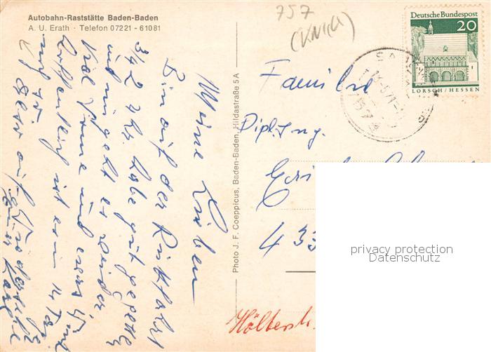 73865708 BADEN-BADEN BW Autobahn-Raststaette Restaurant postalisch gelaufen Erhaltung siehe scans [FriedD77] alte Postkarte Frie Katcode 11110008211000
