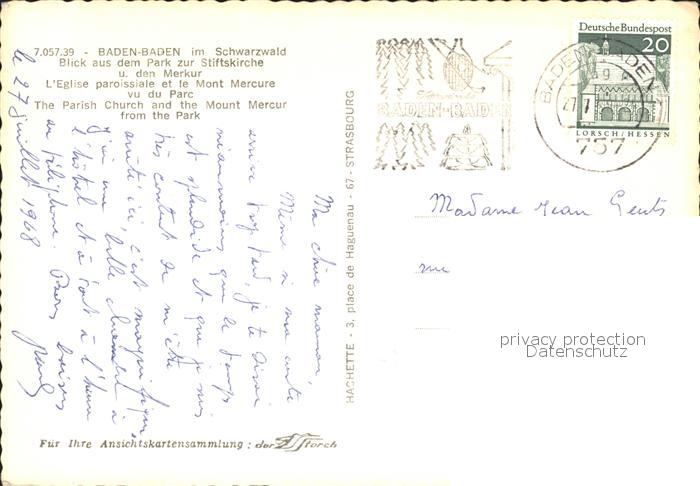 72235750 alte Postkarte BADEN-BADEN BW Blick vom Park zur Stiftskirche postalisch gelaufen Erhaltung siehe scans KatCode: 11110008211000