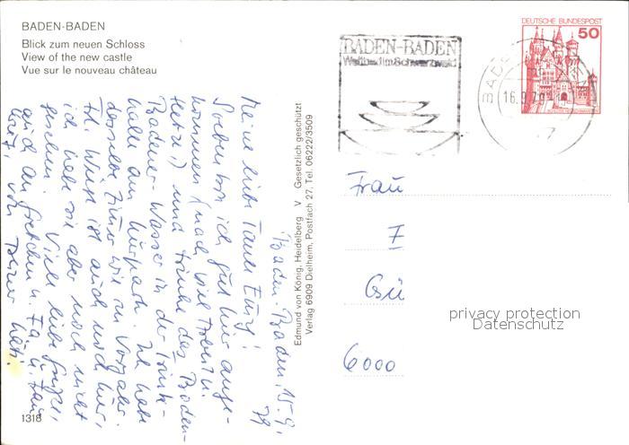 72445874 alte Postkarte BADEN-BADEN BW Blick zum neuen Schloss postalisch gelaufen Erhaltung siehe scans KatCode: 11110008211000