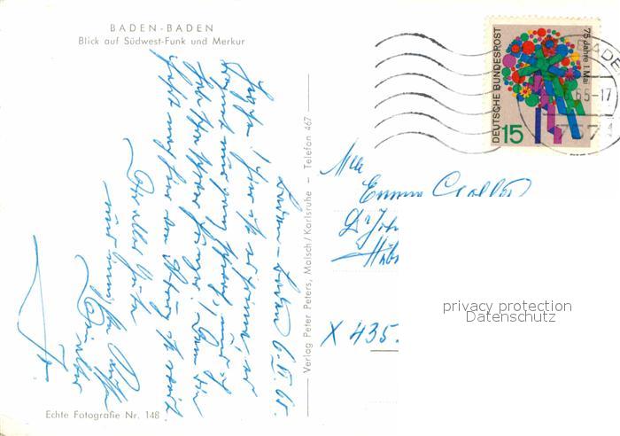 72630476 alte Postkarte BADEN-BADEN BW Fliegeraufnahme mit Merkur und Suedwest-Funk postalisch gelaufen Erhaltung siehe scans [LiesaD40] KatCode: 11110008211000