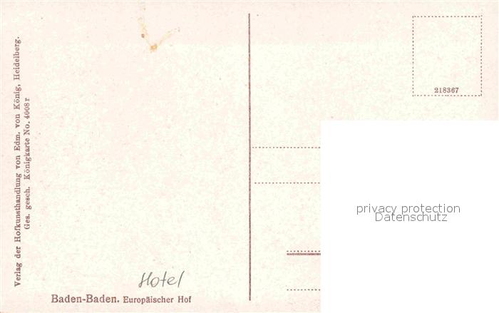 72821131 BADEN-BADEN BW Hotel Europaeischer Hof postalisch nicht gelaufen Erhaltung siehe scans [AndreD76] KatCode: 11110008211000
