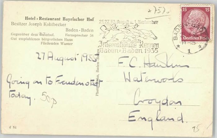 40030474 BADEN-BADEN BW Hotel Restaurant Bayrischer Hof postalisch gelaufen Alte Ansichtskarte Postkarte alte Postkarte Katcode 11110008211000