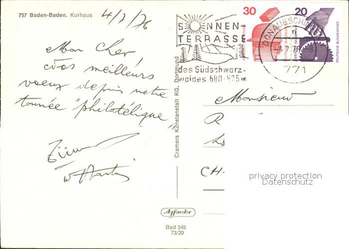 72371094 alte Postkarte BADEN-BADEN BW Kurhaus postalisch gelaufen Erhaltung siehe scans KatCode: 11110008211000