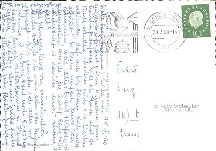 72434658 alte Postkarte BADEN-BADEN BW Kurhaus postalisch gelaufen Erhaltung siehe scans KatCode: 11110008211000