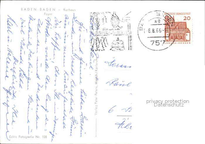 72533008 alte Postkarte BADEN-BADEN BW Kurhaus Foyer postalisch gelaufen Erhaltung siehe scans [LiesaD40 kt094box] KatCode: 11110008211000