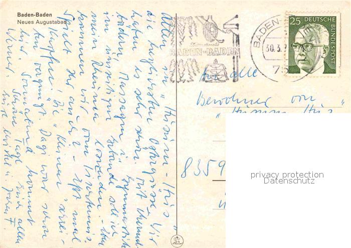 72818587 alte Postkarte BADEN-BADEN BW Neues Augustabad postalisch gelaufen Erhaltung siehe scans [NatalD47] KatCode: 11110008211000