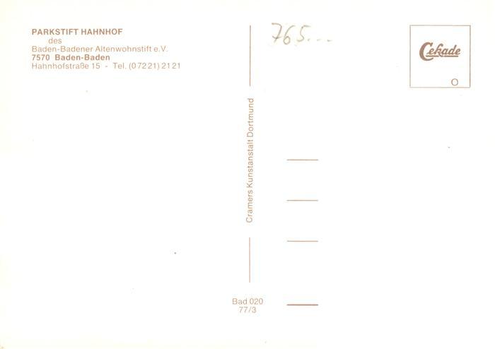 73888176 BADEN-BADEN BW Parkstift Hahnhof postalisch nicht gelaufen Erhaltung siehe scans [FriedD77] Frie Katcode 11110008211000
