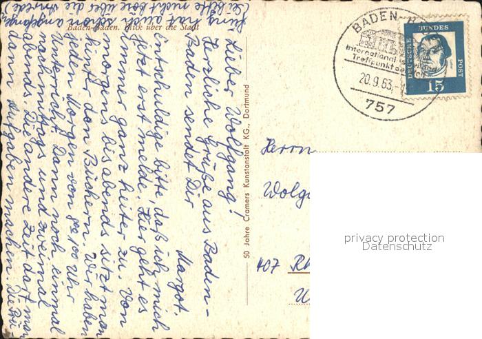 72462034 alte Postkarte BADEN-BADEN BW Stadtansicht postalisch gelaufen Erhaltung siehe scans KatCode: 11110008211000