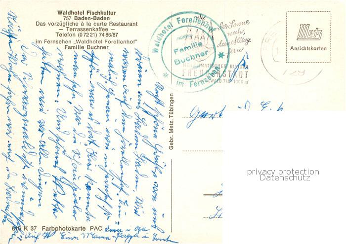 73833837 BADEN-BADEN BW Waldhotel Fischkultur Terrassencafe postalisch gelaufen Erhaltung siehe scans [FriedD77] alte Postkarte Frie Katcode 11110008211000