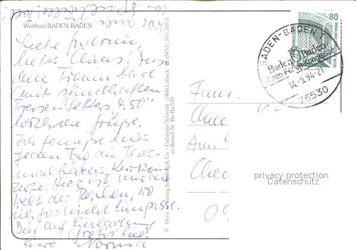72376014 alte Postkarte BADEN-BADEN BW Weltbad Schloss Spielcasino postalisch gelaufen Erhaltung siehe scans KatCode: 11110008211000