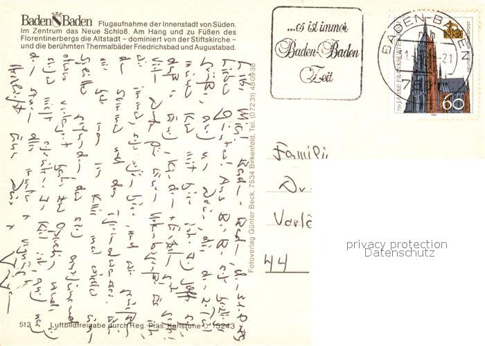 73031322 alte Postkarte Baden-Baden Fliegeraufnahme postalisch gelaufen Erhaltung siehe scans [KathaD81] KatCode: 11110008211000