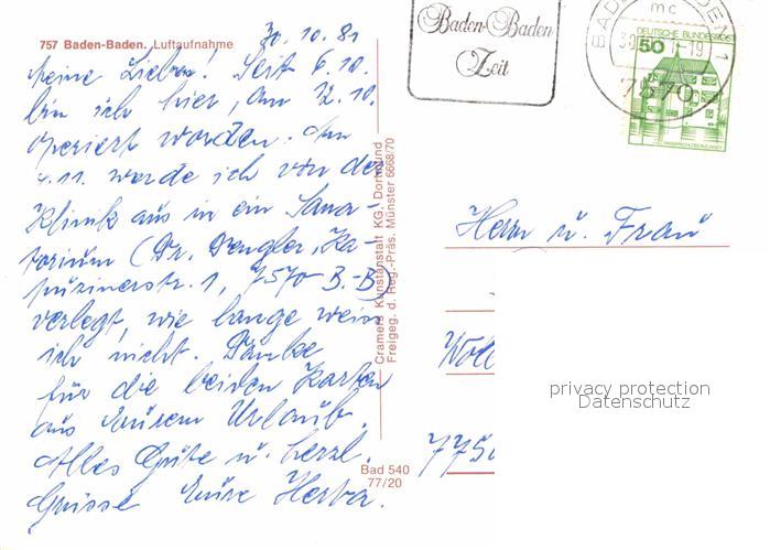 72881291 alte Postkarte Baden-Baden Fliegeraufnahme postalisch gelaufen Erhaltung siehe scans [FriedD77] KatCode: 11110008211000