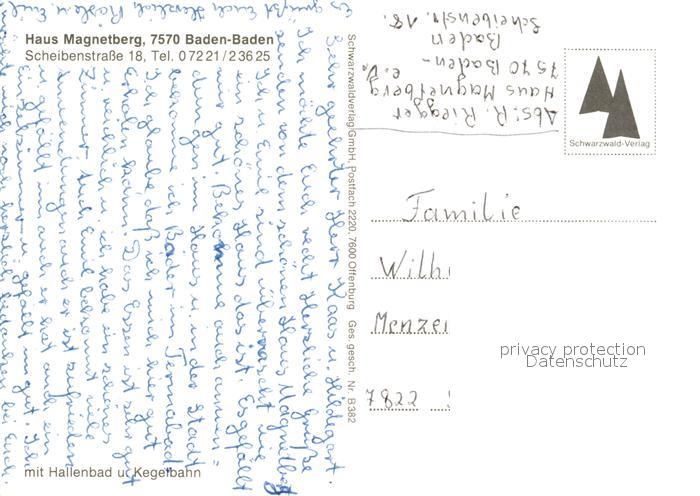 73120731 Baden-Baden Haus Magnetberg Schwimmbad Kegelbahn postalisch nicht gelaufen Erhaltung siehe scans [LiesaD40] KatCode: 11110008211000