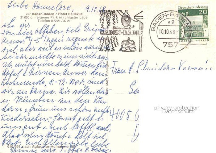 72915553 alte Postkarte Baden-Baden Hotel Bellevue postalisch gelaufen Erhaltung siehe scans [NatalD47] KatCode: 11110008211000