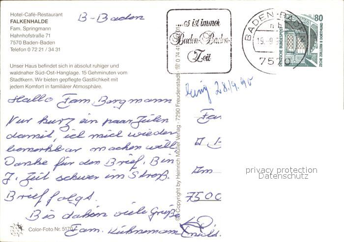alte Postkarte Baden-Baden Hotel Cafe Restaurant Falkenhalde postalisch gelaufen Erhaltung siehe scans