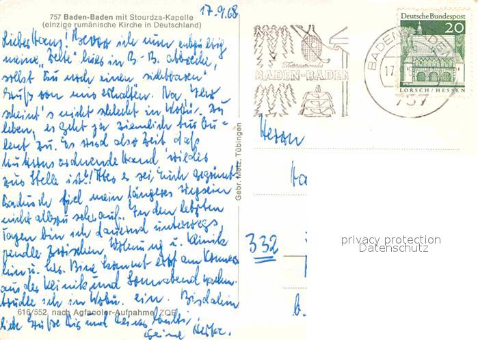 72900984 alte Postkarte Baden-Baden mit Stourdzda Kapelle postalisch gelaufen Erhaltung siehe scans [WerneD78] KatCode: 11110008211000
