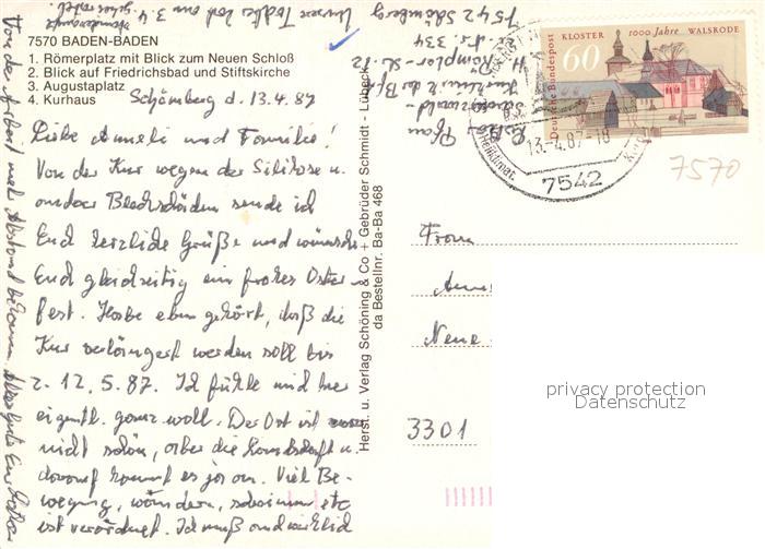 72941464 alte Postkarte Baden-Baden Roemerplatz Neues Schloss Friedrichsbad Stiftskirche Augustaplatz postalisch gelaufen Erhaltung siehe scans [PaolaD17] KatCode: 11110008211000